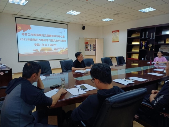 (体工部 彭影报道|摄影 陆双妹)5月11日,体育工作部召开2021年度第五次集体学习暨党史学习教育专题会,会议由直属党支部书记李国和主持,直属党支部委员会、党政办公室、场馆中心、各教研室的教职工参加了学习。