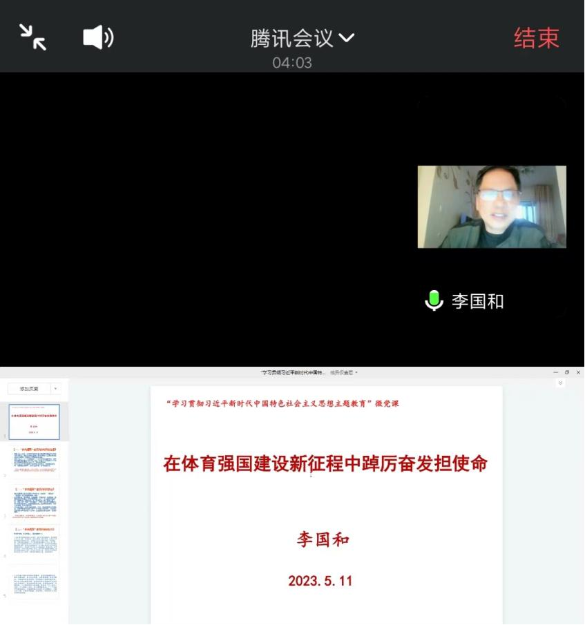 为把学习贯彻习近平新时代中国特色社会主义思想主题教育不断引向深入,2023年5月11日,nba直播 党委书记李国和同志为全体党员上了一堂题目为《在体育强国建设中踔厉奋发担使命》的微党课。