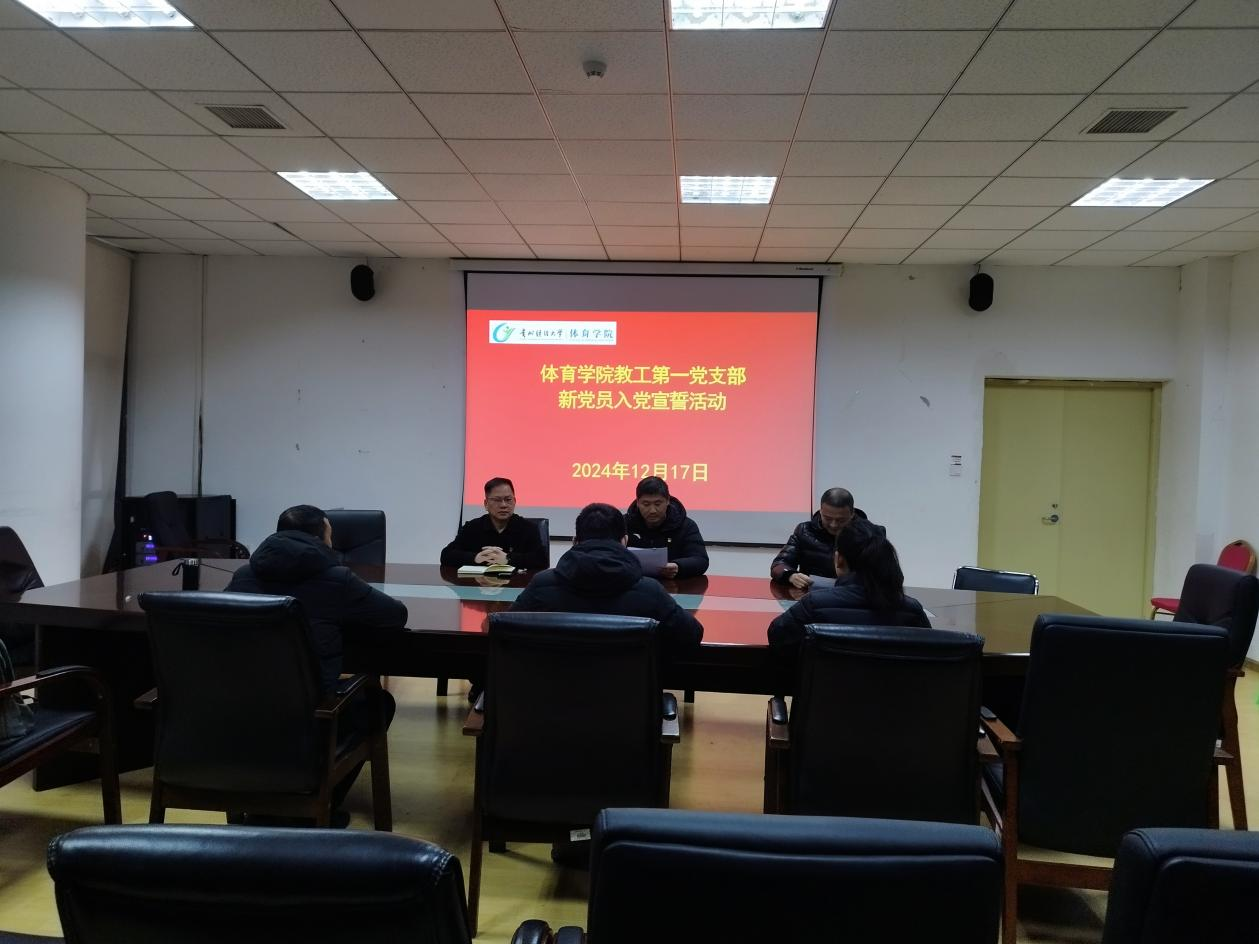 会议室举行新党员入党宣誓仪式。院党委书记李国和、党委副书记、纪委书记(兼)吕骥出席仪式,党委委员、副院长、教工第一党支部书记龚卫华、支委李国良、冉晓鸣、新党员任华参与仪式。仪式由龚卫华主持。