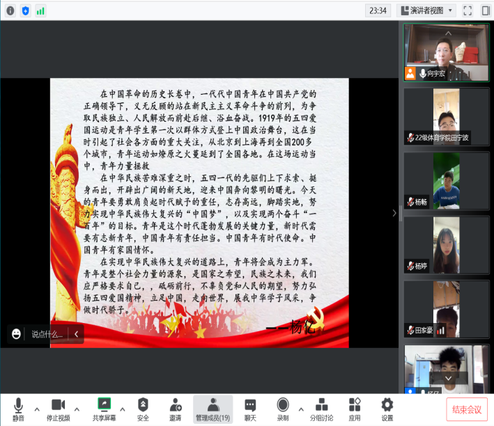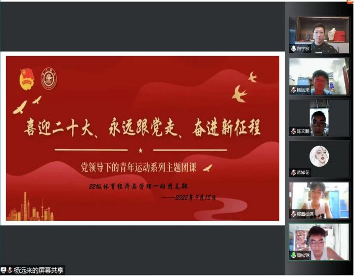 2022年9月17日,我院体育经济与管理1、2班团支部积极响应学校团委要求,通过腾讯会议平台开展“喜迎二十大、永远跟党⾛、奋进新征程”主题教育活动,联合入团积极分子展开了关于“党的青年运动史”学习心得分享,参与人数共计41名同学(团员23名,非团员18名)。
