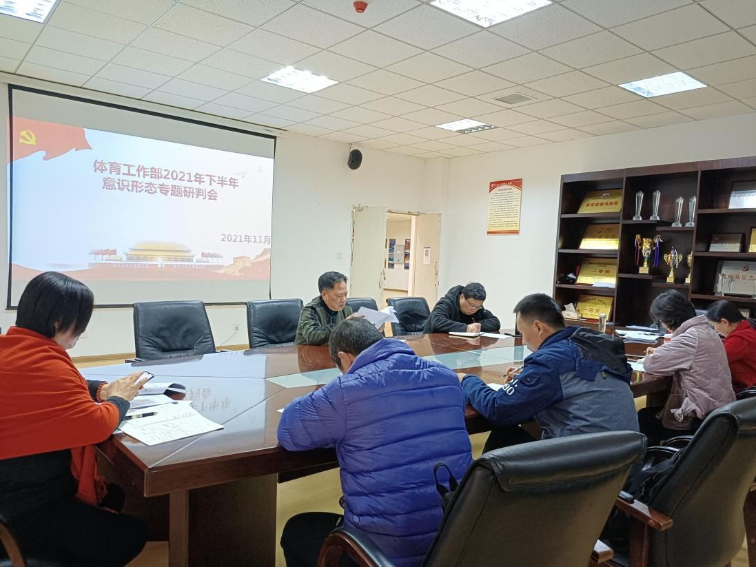 (体工部 陆双妹图文报道)11月 9日上午,体育工作部在会议室召开了2021年下半年意识形态领域工作专题研判会,部门班子、直属支部委员、党小组长、科级干部(含教研室主任)参加会议。本次会议由直属党支部书记李国和主持。