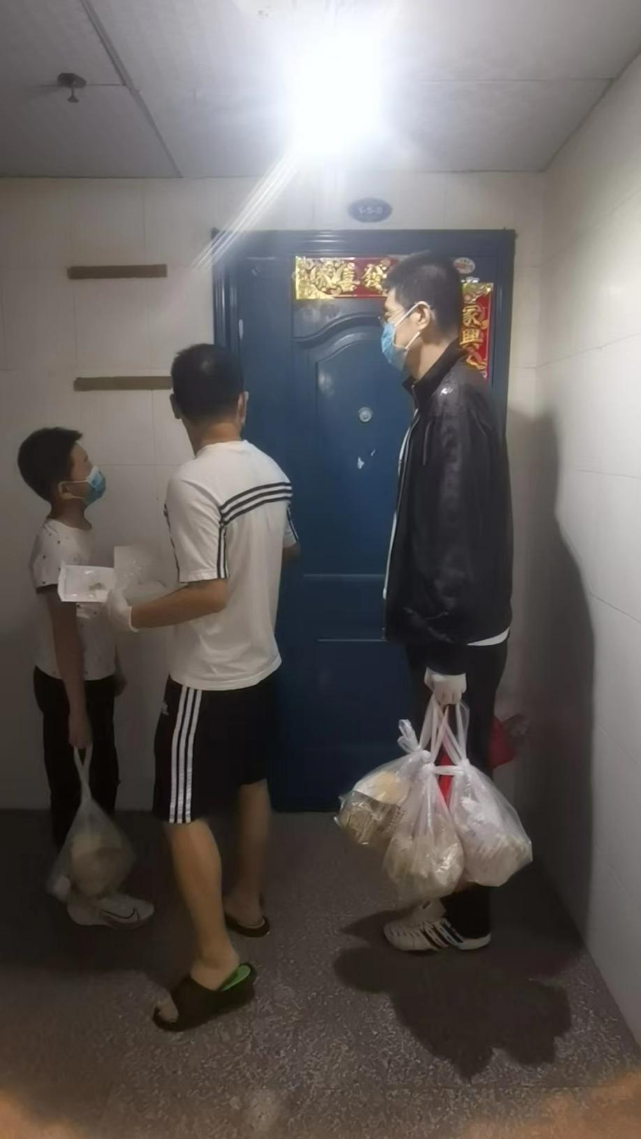 赵东明(右一)和勇敢“体育小志愿者”(左一)在给居民发放物资