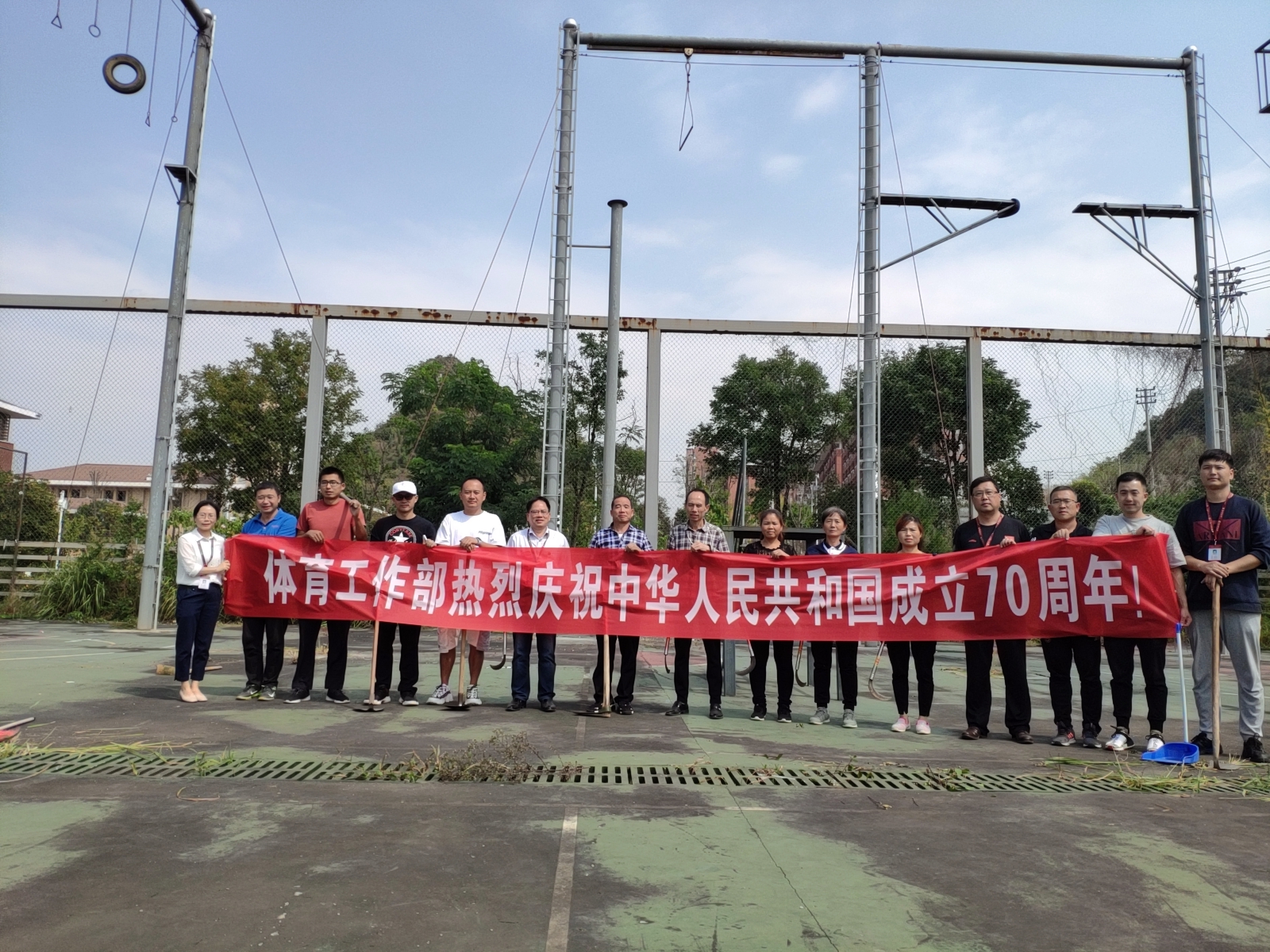 下午,支部组织集体去运动场义务劳动,在拓展场地除草扫地,为即将到来的国庆节美化教学环境。